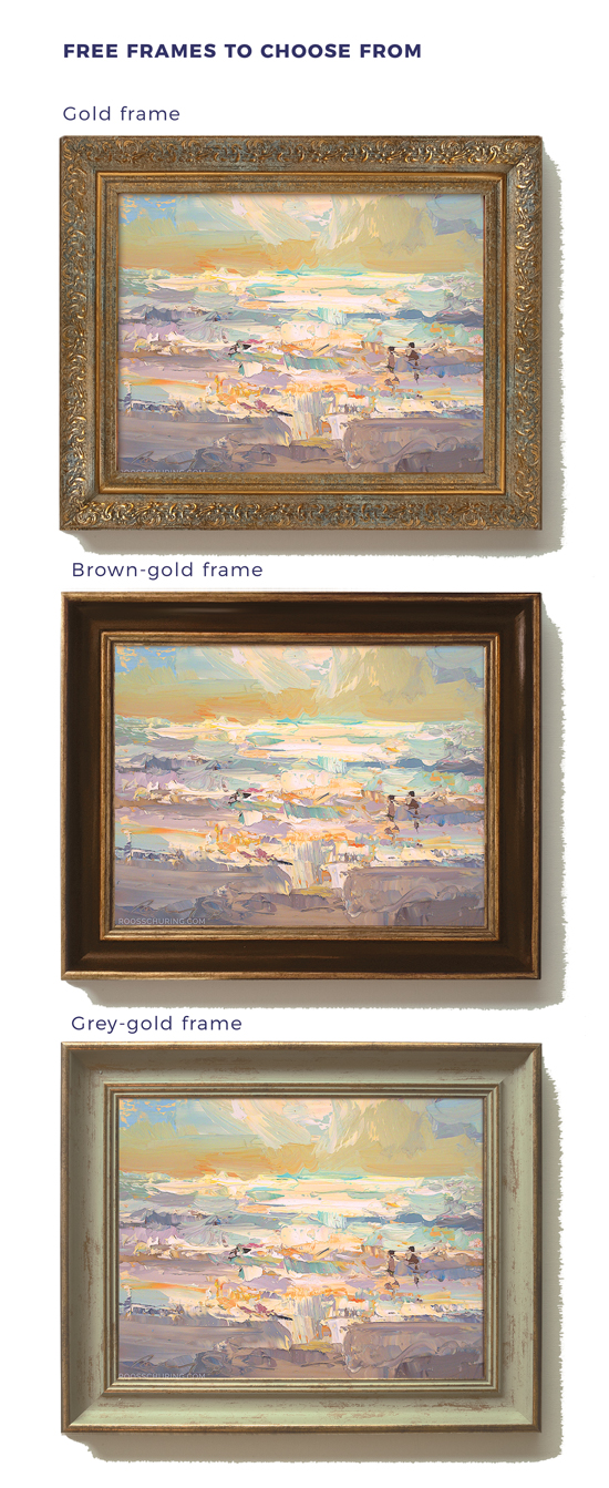 ♦ What is 525 EUR converted to US Dollars? On April 10 - 2026 it's 615 USD. This is a total price, frame and tracked shipping (and tariffs) are already included. The painting arrives ready to hang on your wall.
