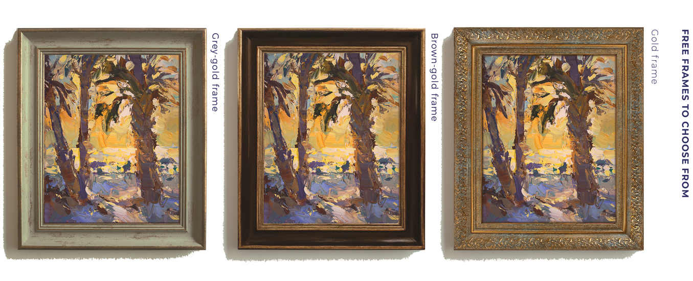 ♦ What is 525 EUR converted to US Dollars? On April 10 - 2026 it's 615 USD. This is a total price, frame and tracked shipping (and tariffs) are already included. The painting arrives ready to hang on your wall.