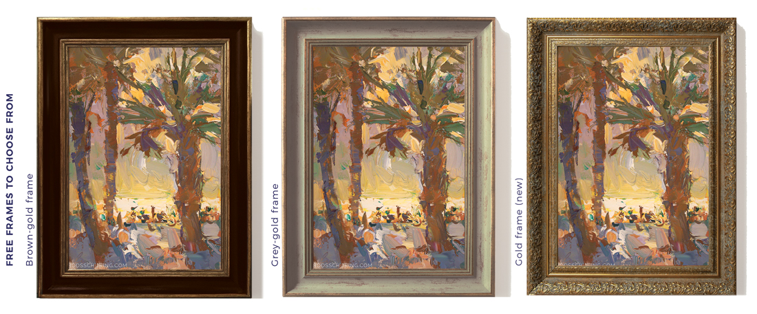 ♦ What is 625 EUR converted to US Dollars? On April 11 - 2026 it's 733 USD. This is a total price, frame and tracked shipping (and tariffs) are already included. The painting arrives ready to hang on your wall.