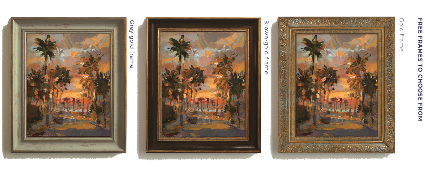 ♦ What is 525 EUR converted to US Dollars? On April 10 - 2026 it's 615 USD. This is a total price, frame and tracked shipping (and tariffs) are already included. The painting arrives ready to hang on your wall.