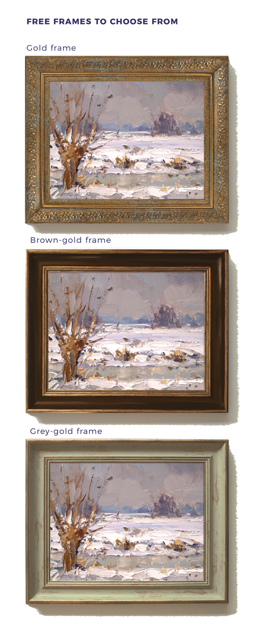 ♦ What is 550 EUR converted to US Dollars? On JAN 19- 2026 it's 640 USD. This is a total price, frame and tracked shipping (and tariffs) are already included. The painting arrives ready to hang on your wall.