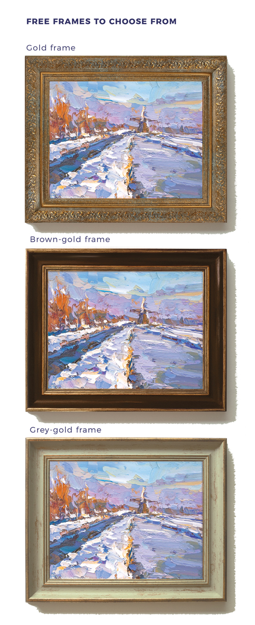 ♦ What is 550 EUR converted to US Dollars? On JAN 19- 2026 it's 640 USD. This is a total price, frame and tracked shipping (and tariffs) are already included. The painting arrives ready to hang on your wall.